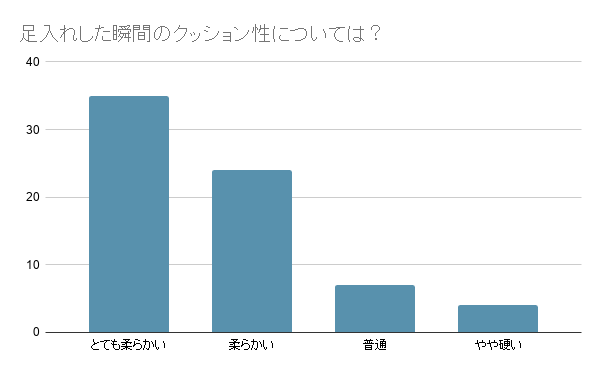 足入れした瞬間のクッション性についても、約半数の方が「柔らかい」「とても柔らかい」とご回答いただきました。 ただし、新たな課題も見えてきました。