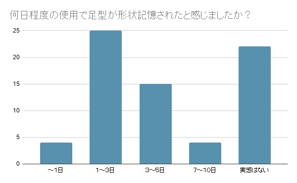ブランドとして、一番力を入れた形状記憶シートについての使用感では、おおむね5日間履いたら実感できたとの声も多かった一方、あまり実感できなかったというお客様も見られました。