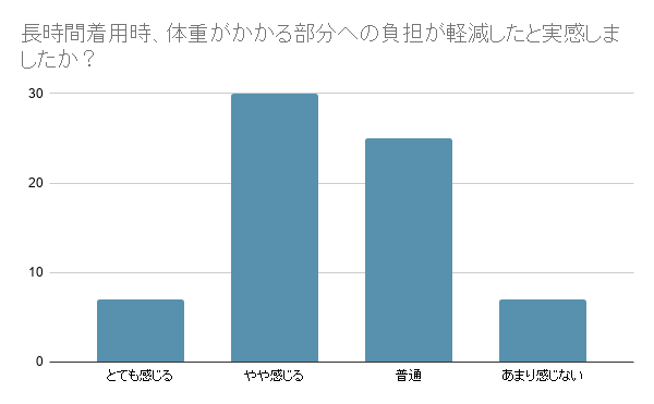 長時間使用時、体重がかかる部分への負担が軽減したと実感したかという質問については、ほとんどの方から「普通」「やや感じる」「とても感じる」とお答えいただきました。