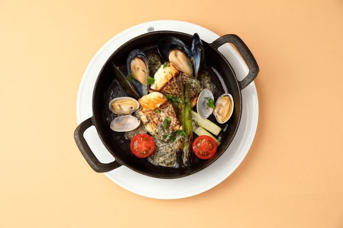 薪窯でじっくりと焼き上げた春の贅沢な一皿です。桜鯛のふんわりとした食感とアスパラガスの香りが調和し、特製のソースで引き立てられます。