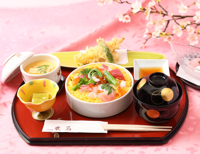 4種類の海鮮や菜の花など多彩な食材を使い、仕上げに桜の花びらの形をしたユリ根をちりばめ、華やかな春の雰囲気を演出しています。