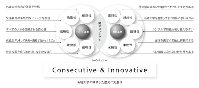 新ロゴマークのコンセプトは「Consecutive&Innovative:名城大学の継続した歴史と先進性」。これまでのエンブレムに代わるロゴマークを立学の精神である「穏健中正で実行力に富み、国家、社会の信頼に値する人材を育成する」をベースに「創造型実学」を実践する大学として、FORSIGHT(先見性)、PROFFESIONAL(専門性)、 DIVERSITY(多様性)を備えた教育・研究・社会連携を進める名城大学を表現しました。