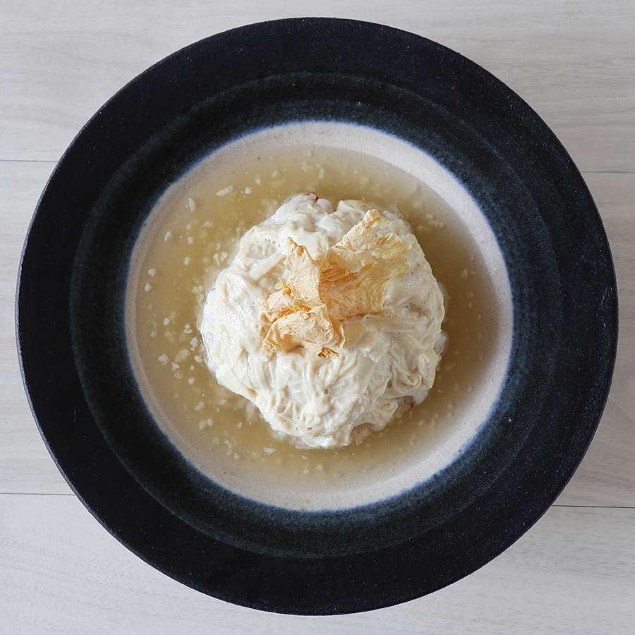 原料は「畑の肉」とも呼ばれる栄養価の高い大豆ですから、良質なたんぱく質を多く含み、古くから精進料理などでは肉の代わりに食べられ栄養豊富な食材として親しまれてきました。ゆばに含まれるたんぱく質量は豚肉と比較しても引けをとらず、それでいて低脂質です※。そんな魅力たっぷりのゆばを、もっと日常的に楽しんでいただきたいと思い、考案したのが「ゆばボウル」。ゆばボウルは、豆庵とうふ工房で朝一番に汲み上げたとろとろの生ゆばとカリカリに揚げたゆばを、ヤマキ醸造の調味料を中心に厳選した素材でつくった温かいソースで有機米ごはんと一緒に食べることで、新しいゆばの味わいと2つの食感が楽しめます。