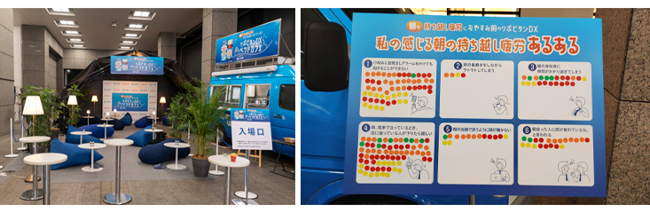 当社は、この「朝の持ち越し疲労」という言葉を広く知っていただくため、「リポビタンDXベッドカフェ」を2025年6月に都内で開催しました。イベントでは、来場者から「朝の持ち越し疲労」にまつわる「あるある」を聴取。その中でも特に多くの共感を得たのが「朝の通勤電車で立っていて、目の前の人が降りると嬉しい」というものでした