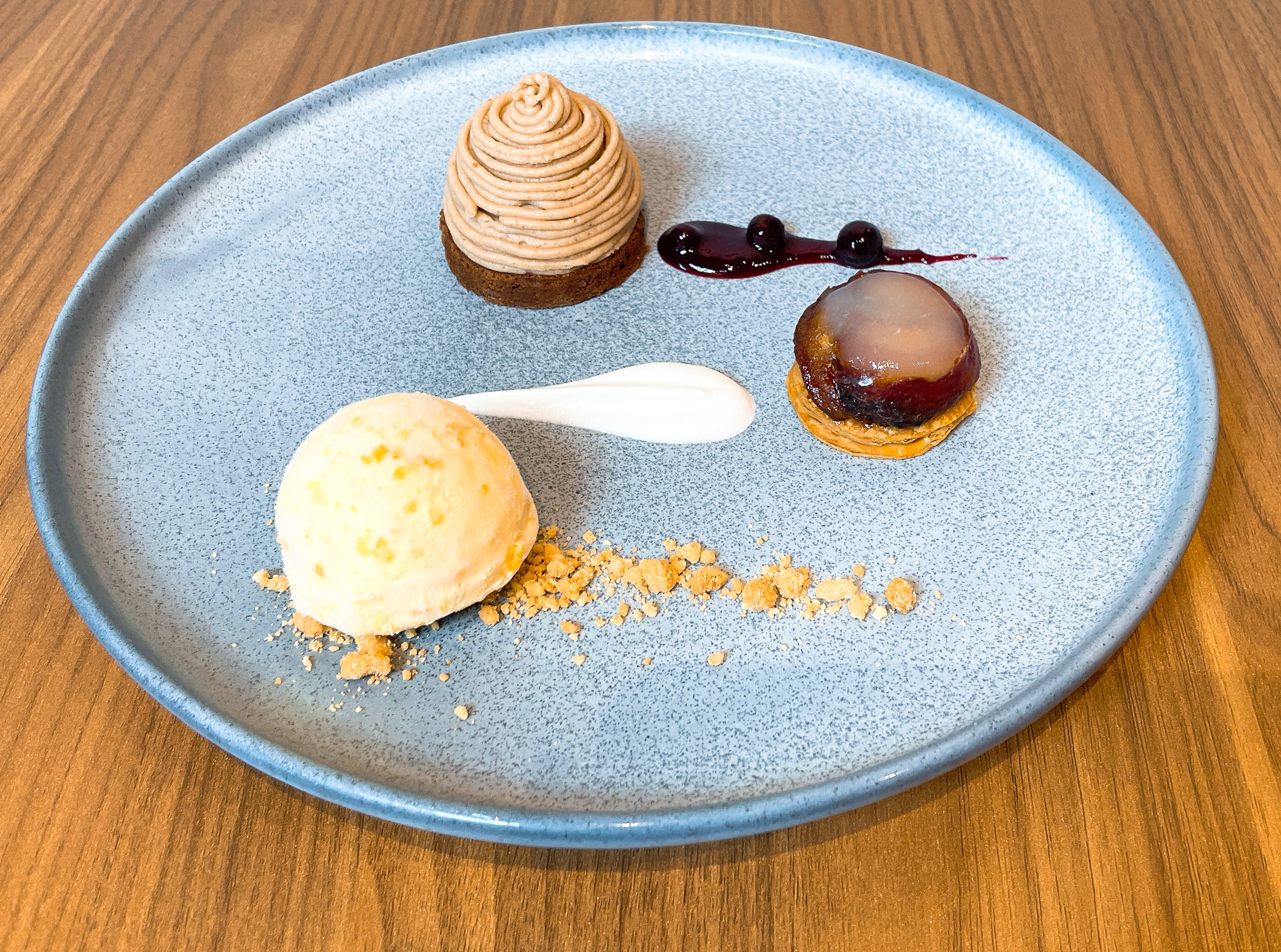 秋の味覚をアートな一皿に仕立てました。栗の風味豊かなモンブラン、香ばしいタルトタタン、爽やかなオレンジピール入りバニラアイス。この三つの主役が織りなす一皿のアート。パティシエ渾身の美しき一皿を、ごゆっくりとご堪能ください。