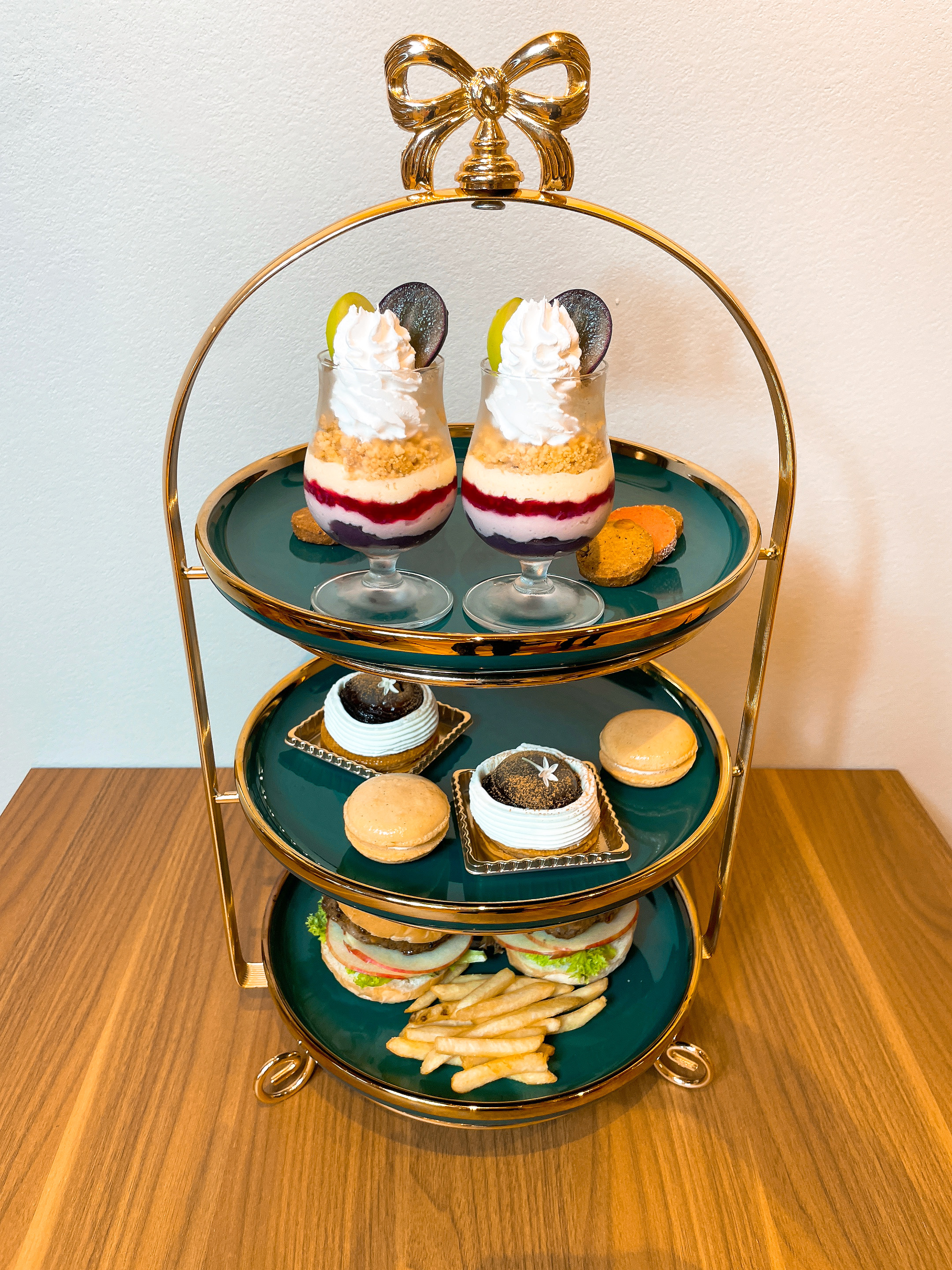 季節の彩りが織りなす、特別なティータイム。シャインマスカットとナガノパープルのミニパフェが目にも鮮やかです。oNCHOCOの香り豊かなクッキーや、バニラ香るラムレーズンのマカロンが甘美なハーモニーを。選べるスイーツは、タルトタタンやショコラテリーヌ、ホワイトショコラテリーヌをご用意。信州牛のミニバーガーとポテトフライで、軽食もお楽しみいただけます。洗練された味わいの数々で、特別なひとときをお過ごしください。