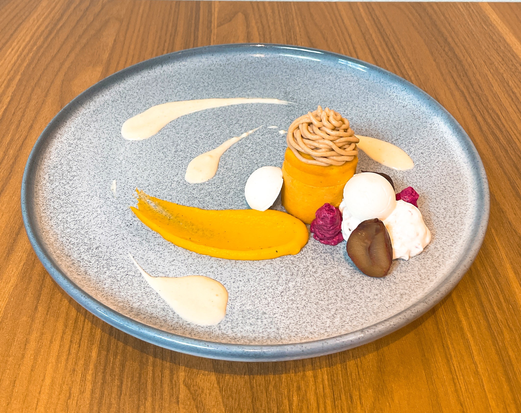 栗の風味豊かなフォンダン・マロン。ラム香るソース、かぼちゃの優しい甘み、きざみ栗の風味が混ざり合い、絶妙なハーモニーを奏でます。