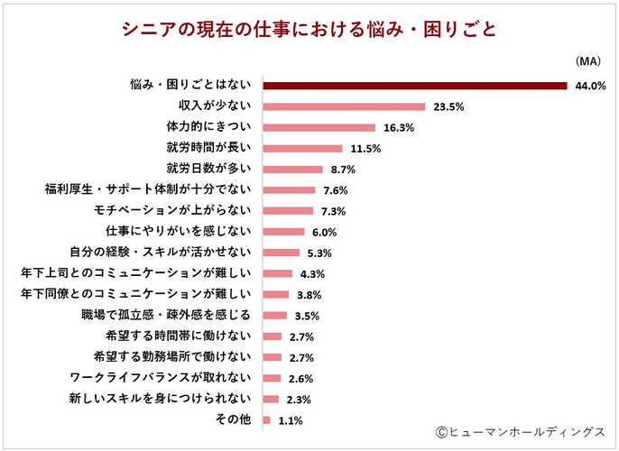 「現在の仕事における悩み・困りごと」(複数回答可)においても、「悩み・困りごとはない(44.0%)が最も多い結果となりました。ここでも現状に対して不満がない状況が見受けられます。