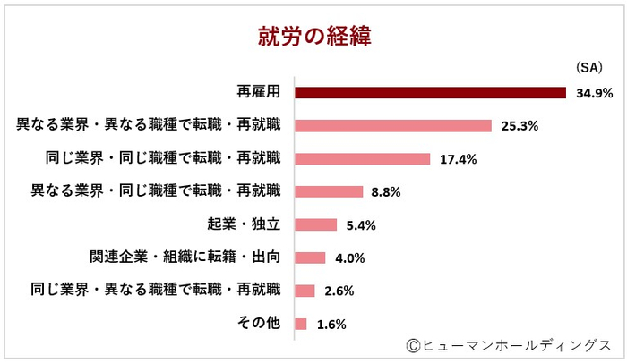 Q2. 現在の職業に就いた経緯は、1位「再雇用」、2位「異なる業界・異なる職種で転職・再就職」