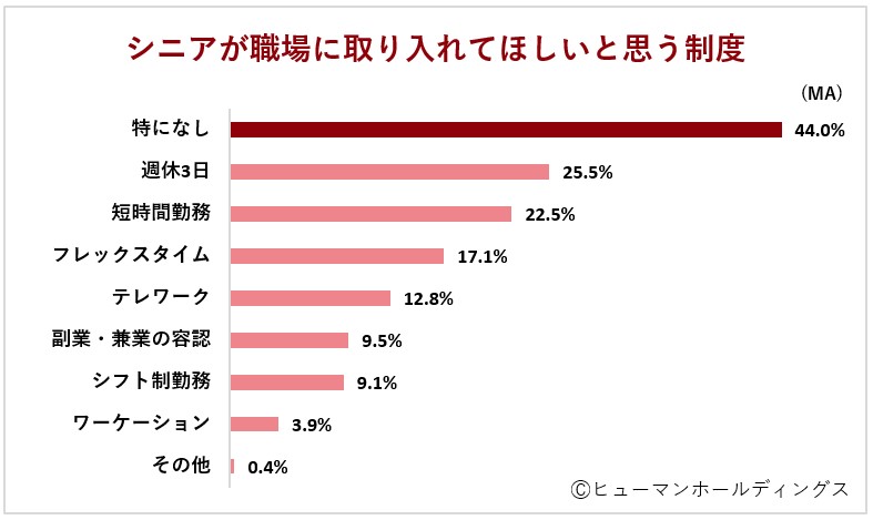 「職場に取り入れてほしい思う制度」(複数回答可)については「特になし(44.0%)」が最も多く、現状に対して不満はないように思われる一方で、「週休3日(25.5%)」「短時間勤務(22.5%)」と、休日や就労時間に対する総計は48%にのぼり、働く日数や時間を減らしたい意向も見受けられます。