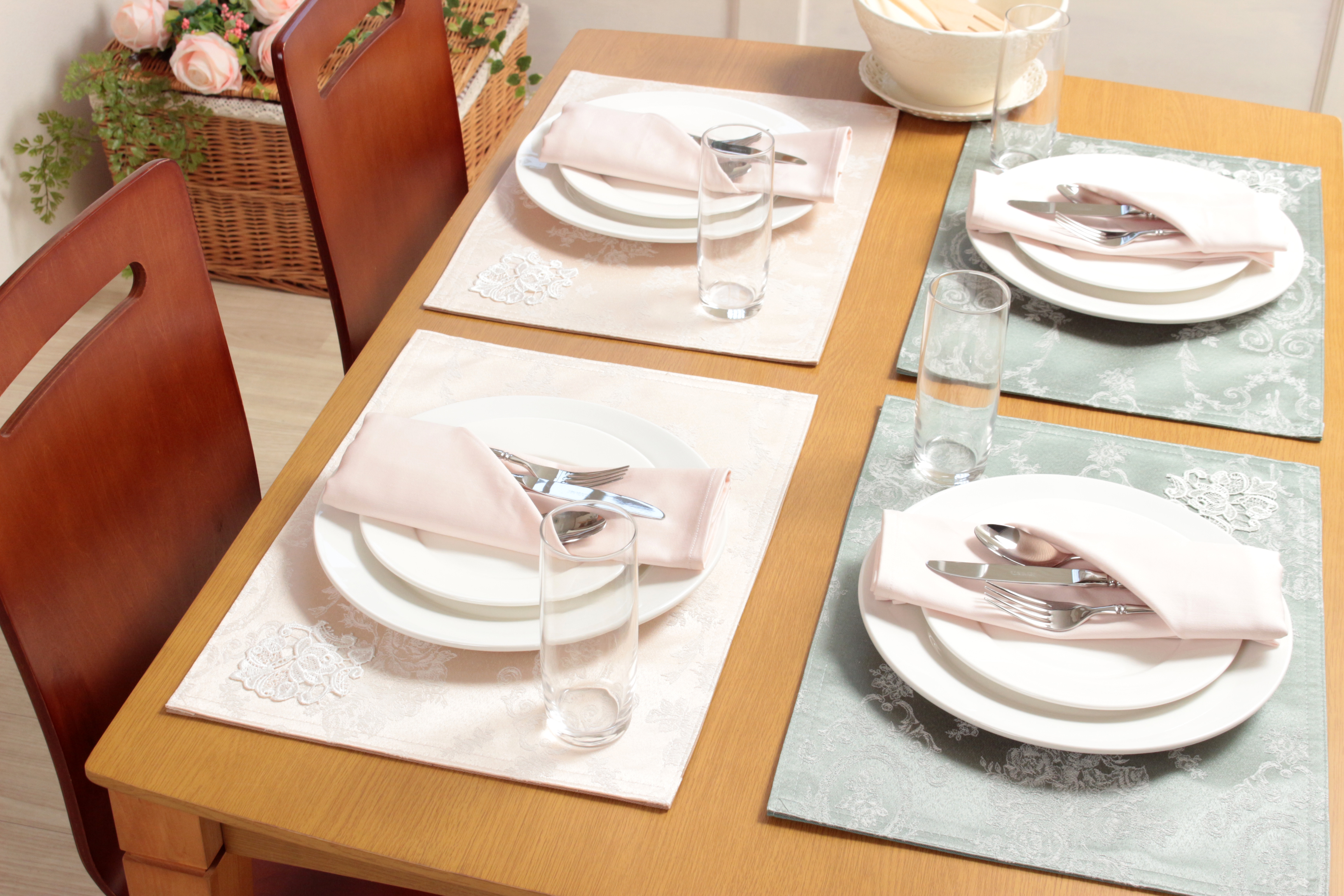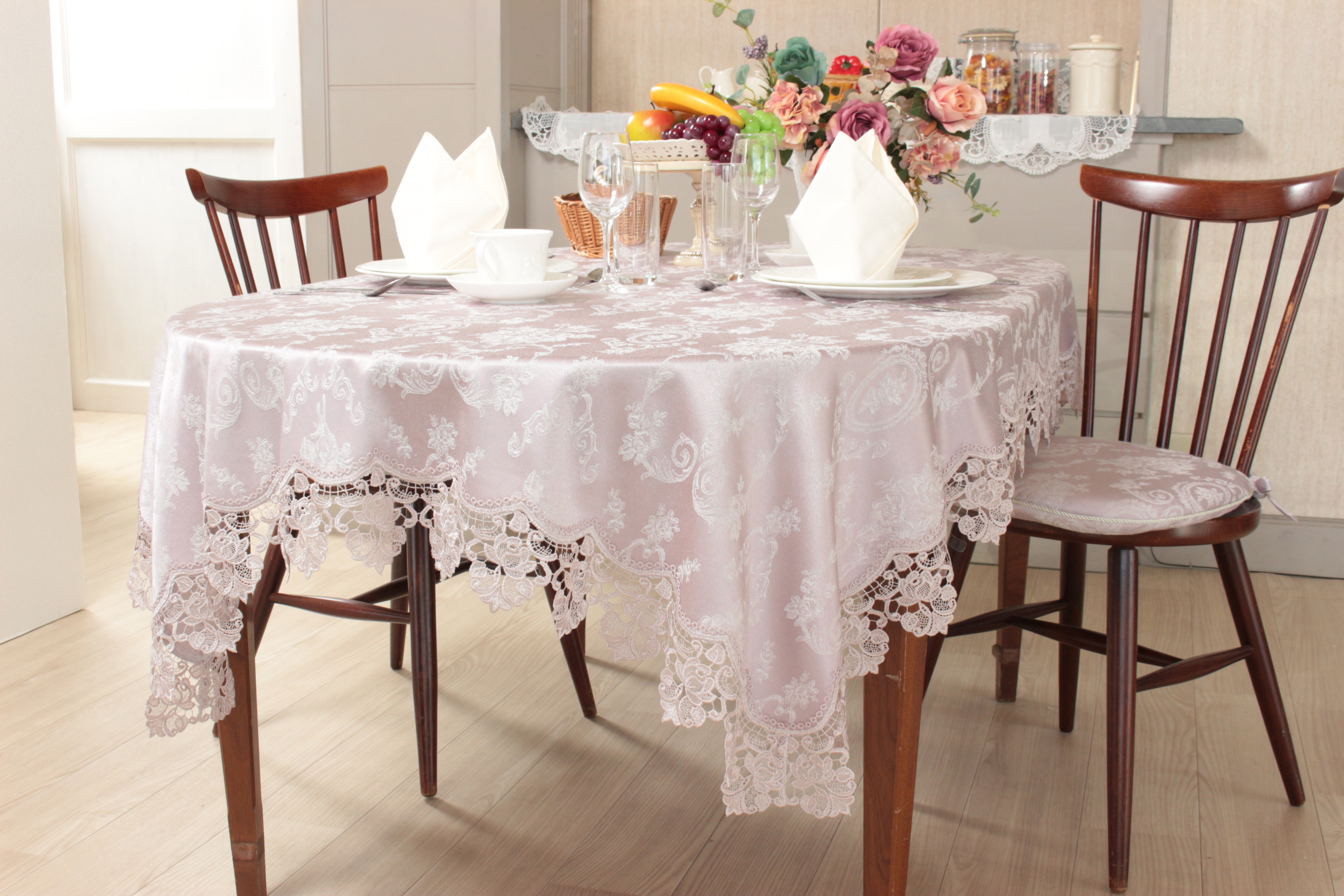 レースと撥水加工ジャカード織のテーブルリネンコレクション