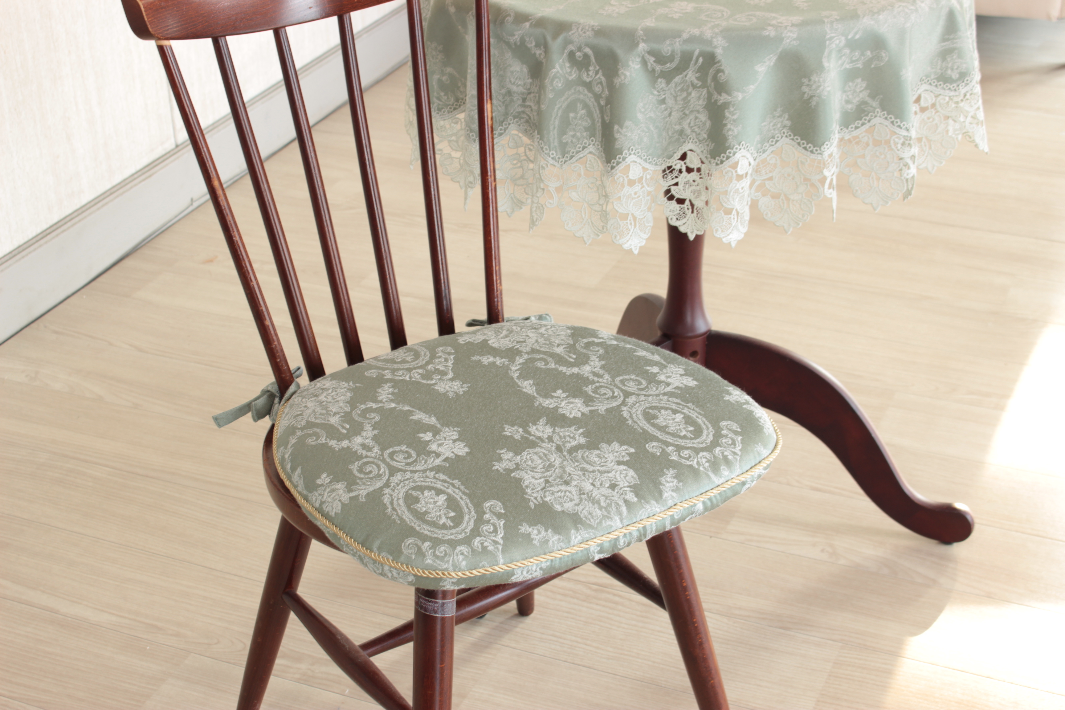 今回のバーゲンのメイン商品として、ヒットシリーズ「メイユール」をご紹介いたします。撥水加工が効いた艶のあるジャカード織生地に、ローズモチーフのケミカルレースをあしらったテーブルリネンです。優雅なテーブルメイクが楽しめるとともに、水分をこぼしてもサッと拭くだけで安心。ご家庭でお洗濯も出来て清潔に使えるリネンです。ランチョンマットやダイニングクッション、母の日ギフトにもおすすめのエプロンなどをご用意しております。