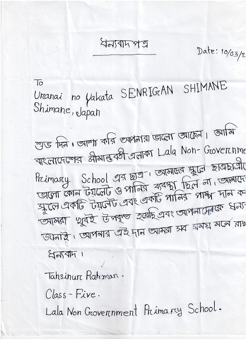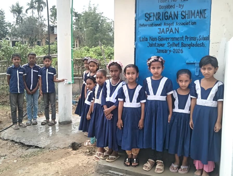 このたび、2026年3月10日、島根千里眼の支援により、シレット県ジョインタプール郡ララ村にあるララ村営小学校へトイレ一式を寄贈しました。同校には約150名の生徒が通っており、衛生環境の改善により子どもたちが安心して学校生活を送れる環境が整いました。