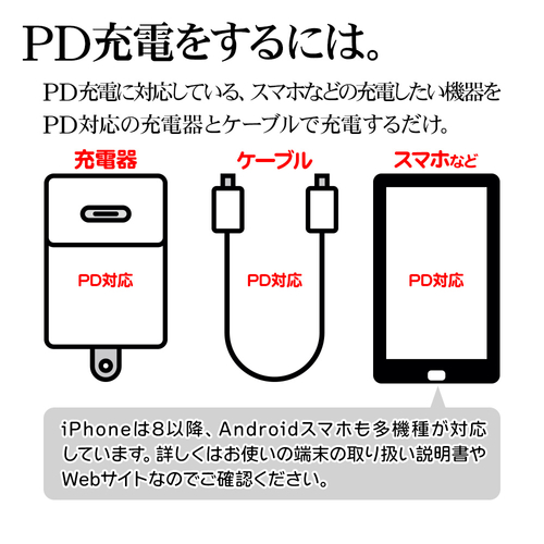 Type-CポートはQuickCharge(以下QC)とPower Delivery(以下PD)に対応しています。