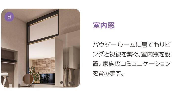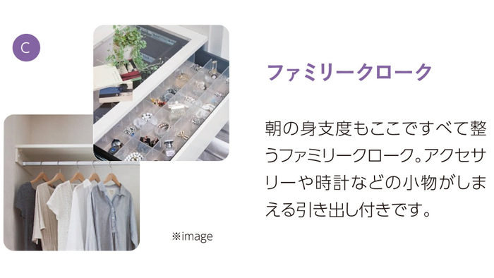 リビングイン洗面は、テレビを見ながらメイクができるので、朝の忙しい時間でも効率的な身支度を可能に。また、ファミリークロークにはお出かけ前にサッと身だしなみのチェックができる全身鏡を設置しました。アクセサリーや時計などの小物がしまえる引き出しもあり、一か所でトータルコーディネートが可能です。