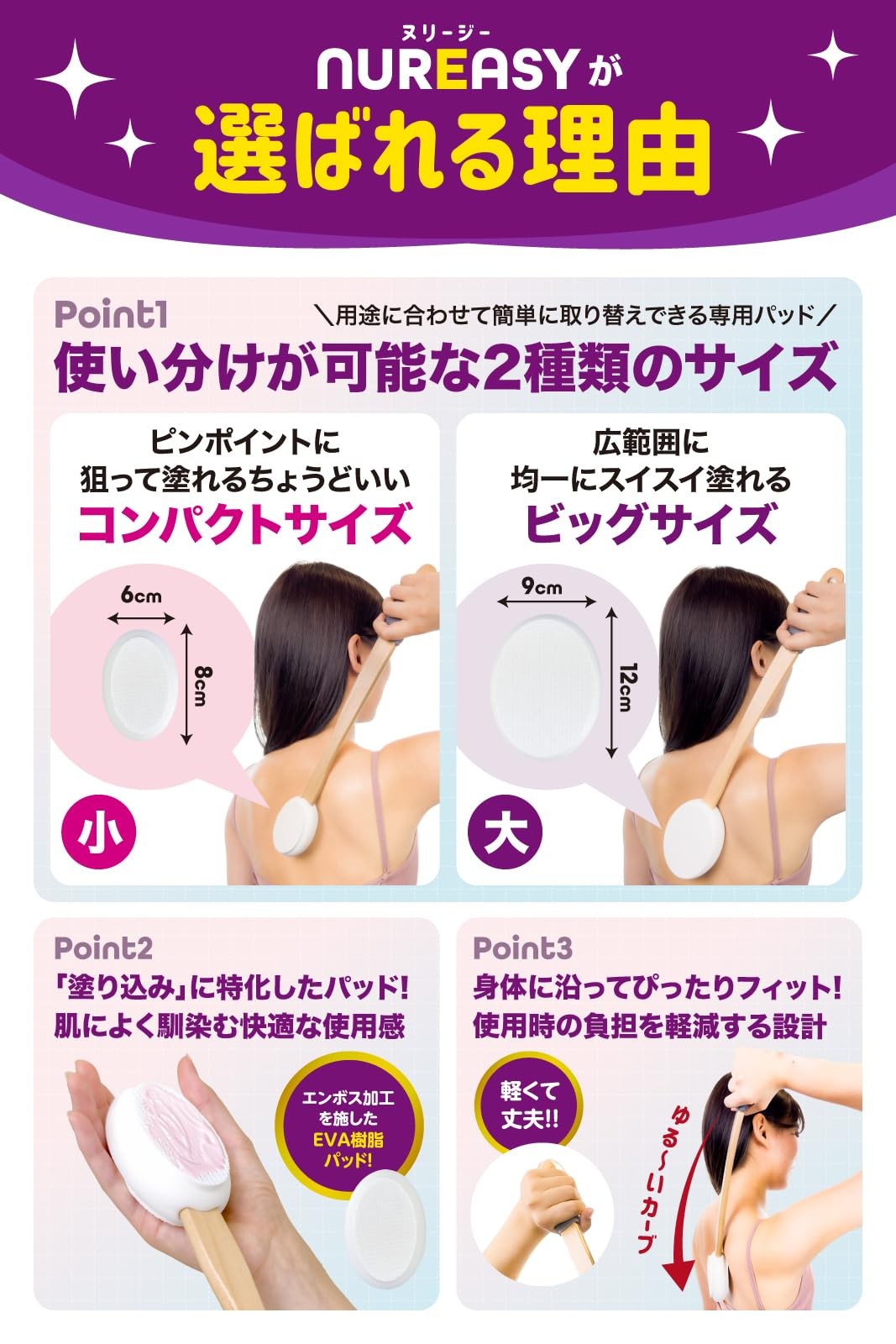 ひとりでもラクに背中へ塗布できる“背中専用塗布器具 ”ヌリージーです。