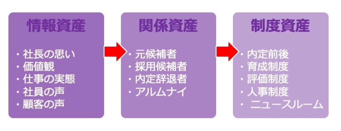 情報資産とは、ニュースルームなどの自社メディアに「事実・感情・意味付け」を伴った情報を蓄積することです。関係資産とは、未来から現在に至るステークホルダーをリストとして蓄積することです。蓄積したリスト(採用候補者など)との関係を継続的に育てます。制度資産とは、採用広報、選考・内定前後のコミュニケーション、入社後の育成・評価・人事制度を分断せず、一貫した思想と設計のもとで接続・仕組み化することです。