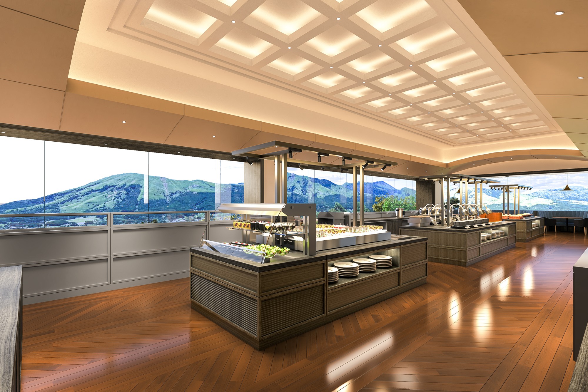 阿蘇五岳の雄大な景色を切り取るワイドガラス設計のレストランは、席に着いた瞬間から眺望をお楽しみいただける研ぎ澄まされた空間が広がります。