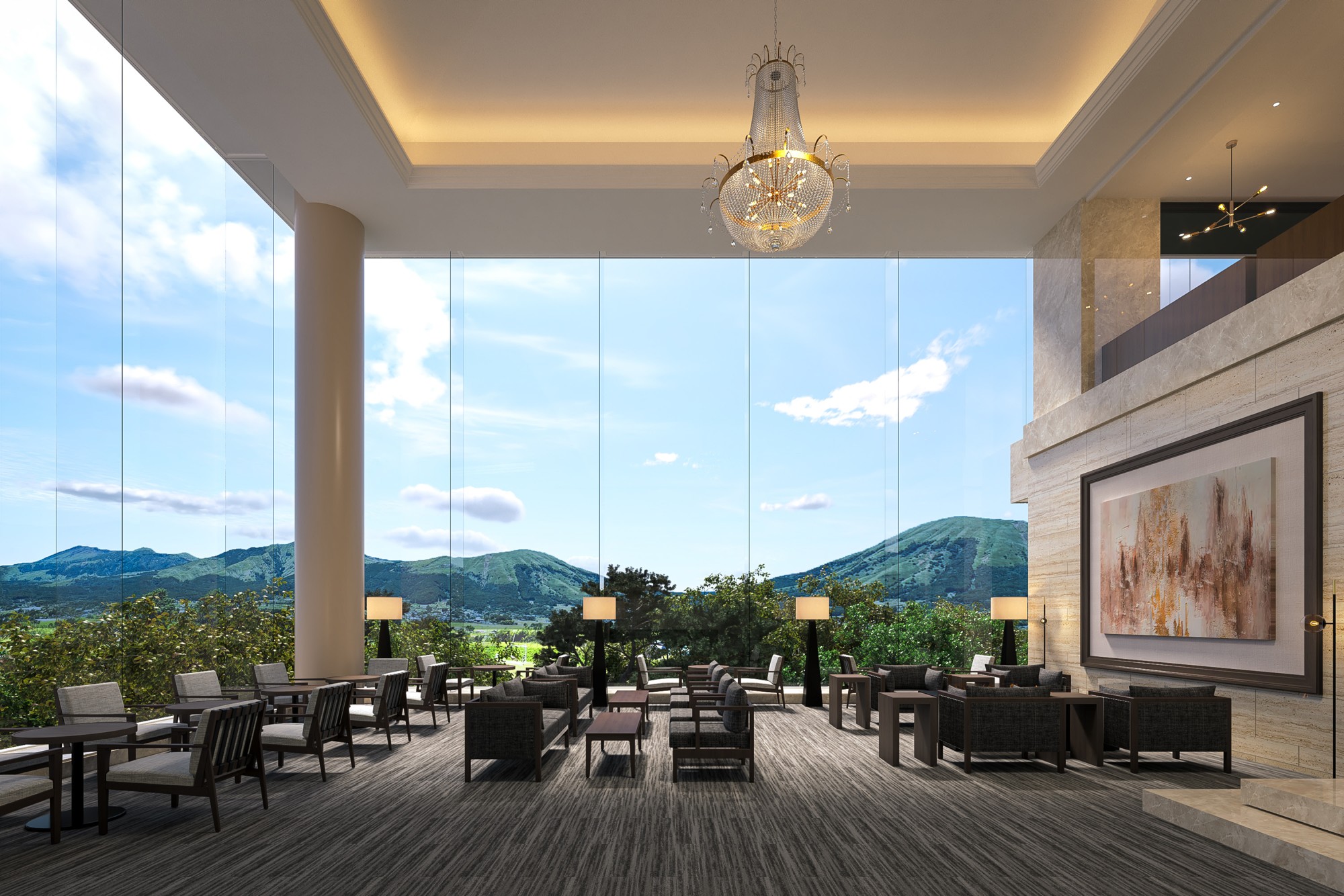 圧倒的な開放感を誇るラウンジは、室内にいながら阿蘇五岳のパノラマをまるで一枚の絵画を見ているかのように堪能できます。