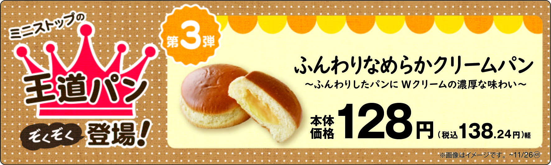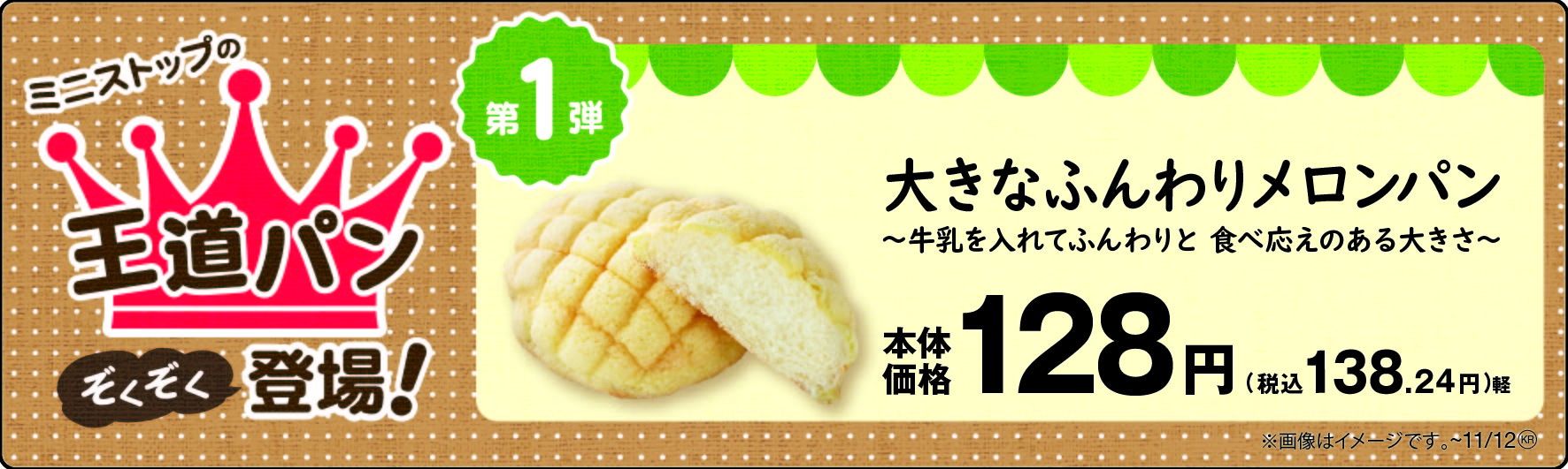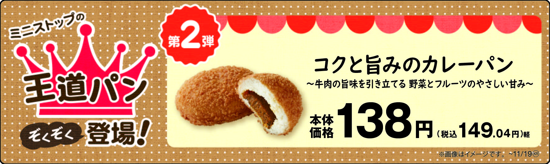 ミニストップの王道パン ぞくぞく登場! 大きなふんわりメロンパン第1弾!10月31日(火)発売 コクと旨みのカレーパン第2弾!11月7日(火)発売 ふんわりなめらかクリームパン第3弾!11月14日(火)発売