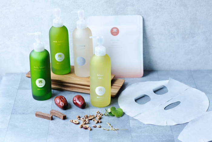 界の和漢スキンケアアメニティ:生薬としても用いられるサンザシ、ナツメ、ユキノシタ、ハトムギ等のエキスを配合。湯上がり後に使用することで、肌を整えます。クレンジング、化粧水、乳液、ボディーローションがあります。界の全客室、大浴場の脱衣所に、設置しています。