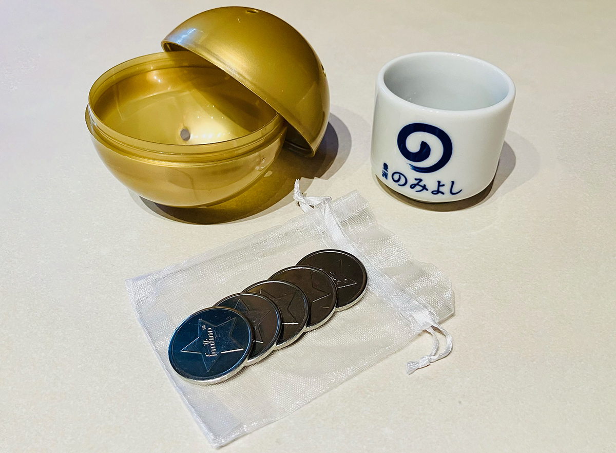 気軽に利き酒ができる日本酒スタンド「豊洲のみよし」では、常時約30種の全国各地の日本酒をコイン式サーバーにご用意しています。1個2000円のカプセルトイ(ガチャガチャ)の中には、オリジナルお猪口とコイン5枚が入っています。日本酒は、コイン1枚でお猪口1杯分を利き酒することができます。のみ終わったお猪口は、お土産としてお持ち帰りいただけます。