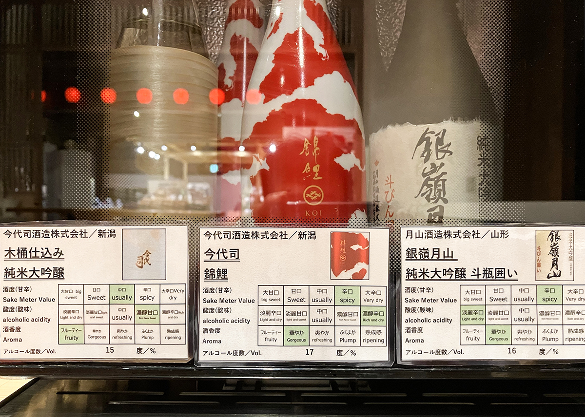 サーバーの前面にも酒度、酸度、酒香度を示したカードを付け、日本酒に不慣れなお客様でも、好みの日本酒探しをお楽しみいただくことができます。酒は四季毎に変わる季節酒をはじめ、定期的に変更しています。