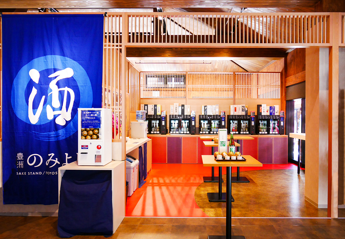 「豊洲 千客万来」内にある総合土産物店「豊洲えんぎもの」の一角にある日本酒スタンド「豊洲のみよし」は、常時約30種の全国各地の日本酒を味わえる立ち飲みスポットです。カプセルトイ(ガチャガチャ)でコイン5枚とオリジナルお猪口を買い求めいただき、ご自身で好きな日本酒を選んでサーバーから注いで飲むことができます。