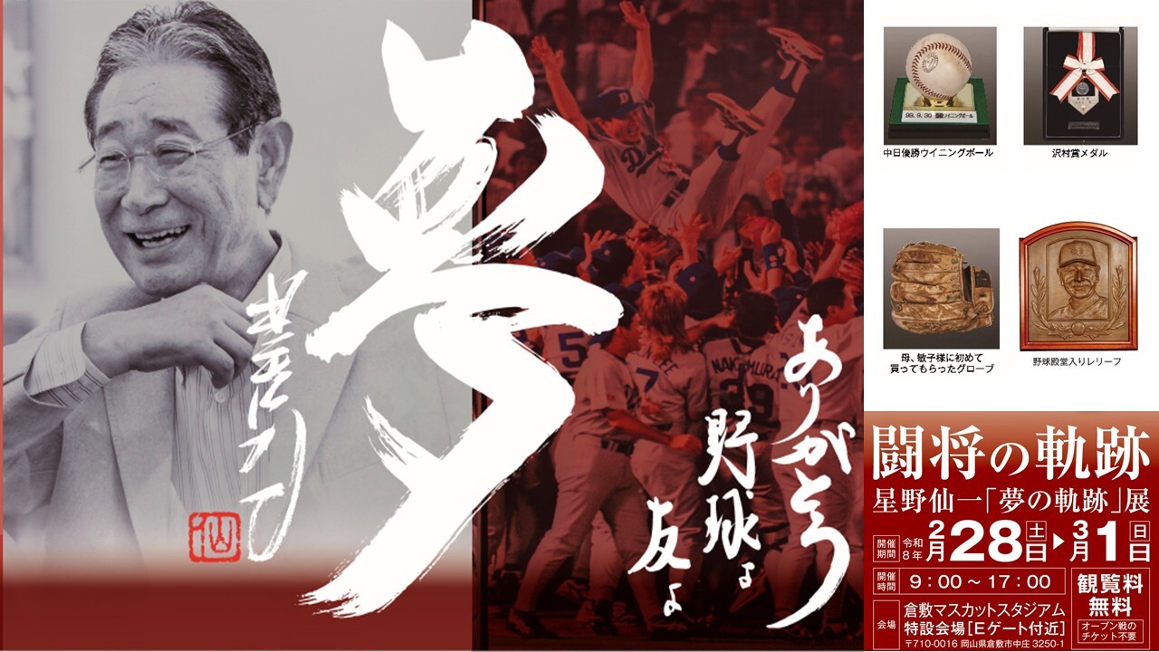 倉敷市「闘将の軌跡 星野仙一『夢の軌跡』展」を 2月28日~3月1日に 倉敷マスカットスタジアム外周特設会場(Eゲート付近)で開催