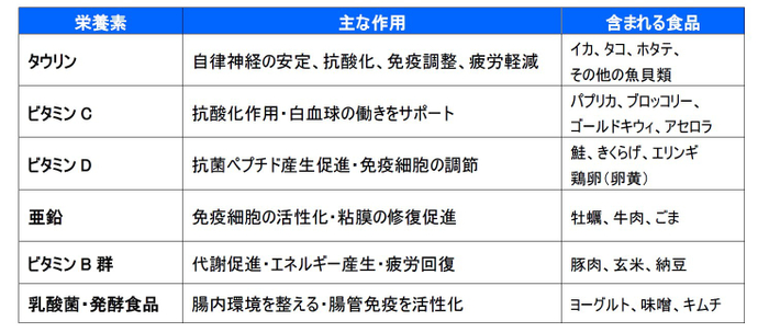このように、複数の栄養素が互いに補い合いながら、体の防御機能を支えています。特定の成分だけに頼るのではなく、バランスよく取り入れていくことが、風邪に負けない体づくりの基本といえるでしょう。