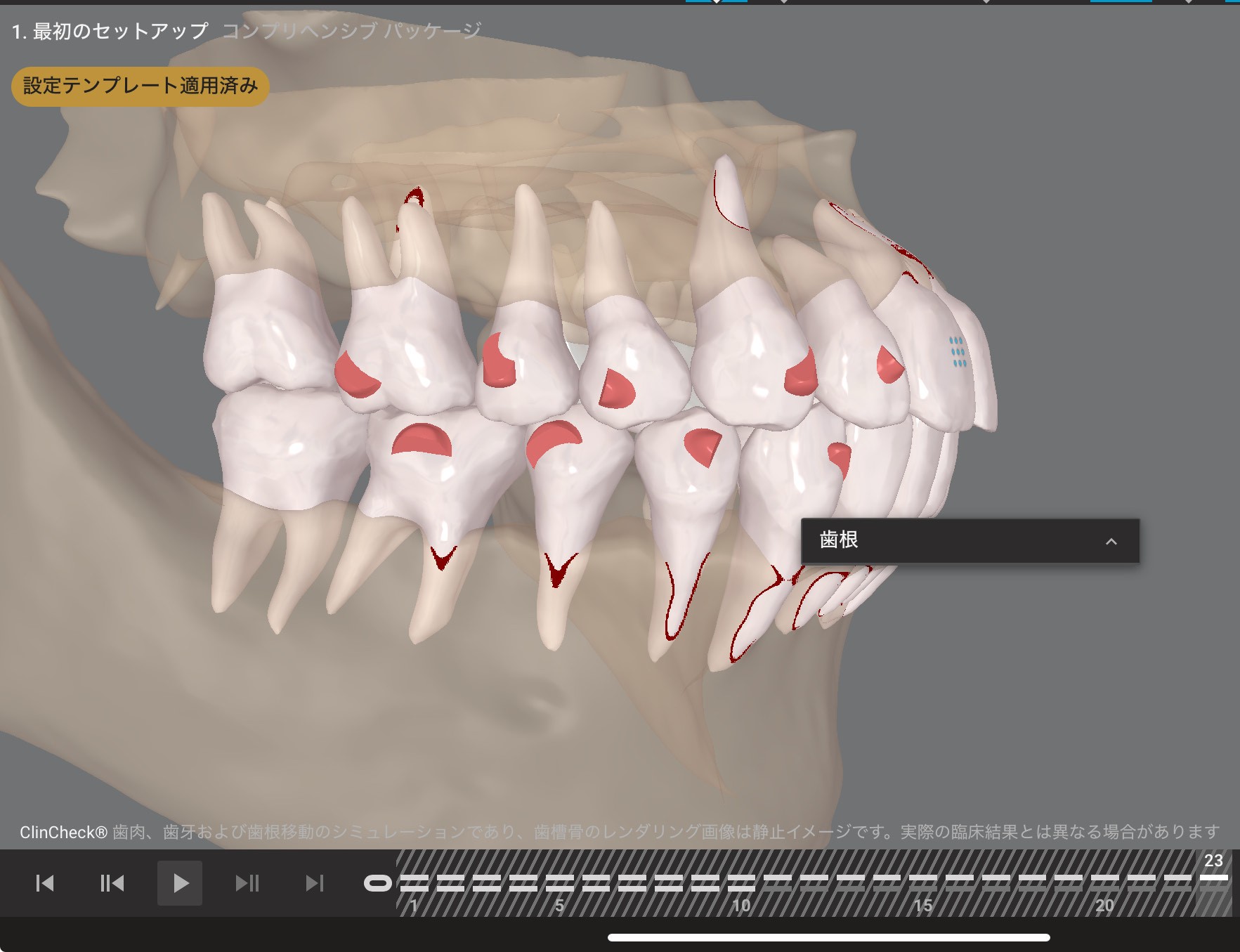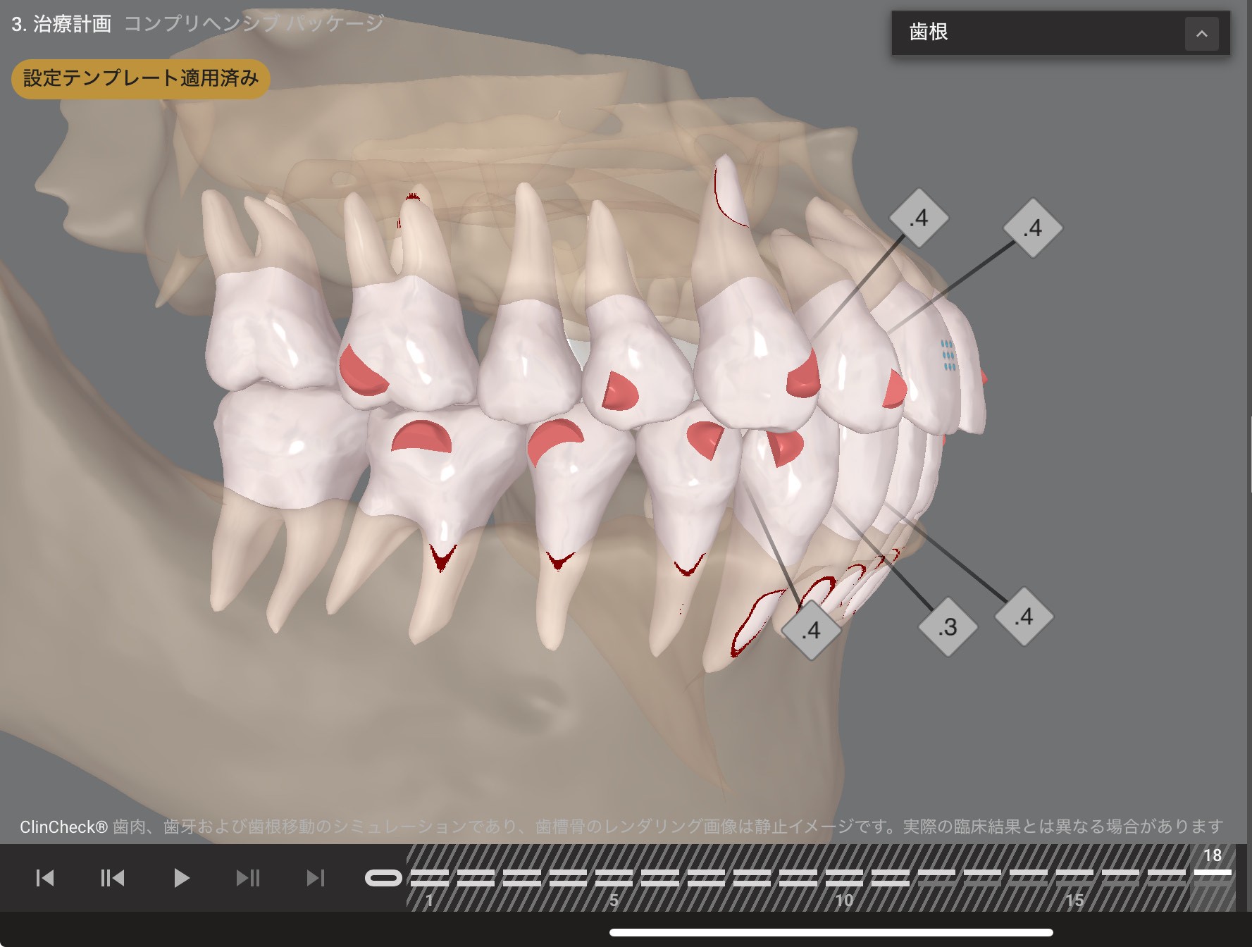 画像下に表示されている数字は、使用するマウスピースの枚数を示しており、1枚あたりの装着期間は一般的に約7〜10日とされている。