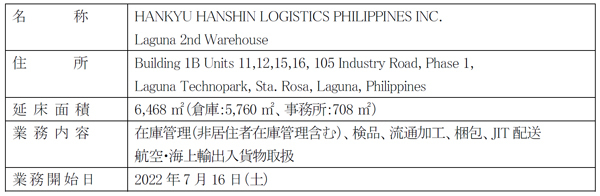 当社フィリピン現地法人であるHANKYU HANSHIN LOGISTICS PHILIPPINES INC.は、首都マニラ近郊ラグナ州の工業団地「ラグナテクノパーク」内にあるラグナ本社倉庫に隣接する「ラグナ第二倉庫」を開設し、7月16日より営業を開始します。