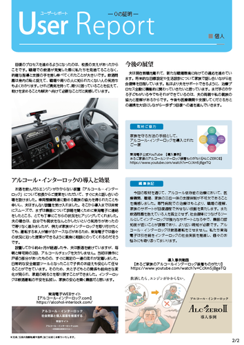 アルコール問題に対する社会的な取り組みを推進する東海電子株式会社(本社:静岡県富士市 代表取締役 杉本 哲也)は、 “お酒を飲んだら、エンジンがかからない”アルコール・インターロック装置「ALC-ZERO」を導入された方のユーザーレポートを2月12日にホームページに公開いたしました。