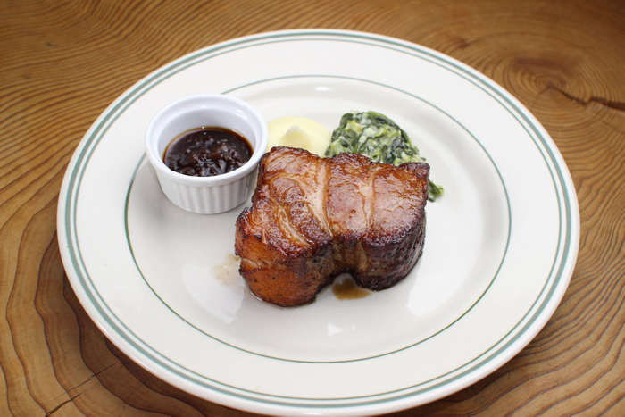 真空低温調理で火を通した豚肉を、仕上げにオーブンでクリスピー状に焼き上げた分厚いポークステーキは、表面の香ばしさが食欲を刺激し、ナイフを入れるとしっかりした肉質ながらもあまりのやわらかさに感動を覚える。