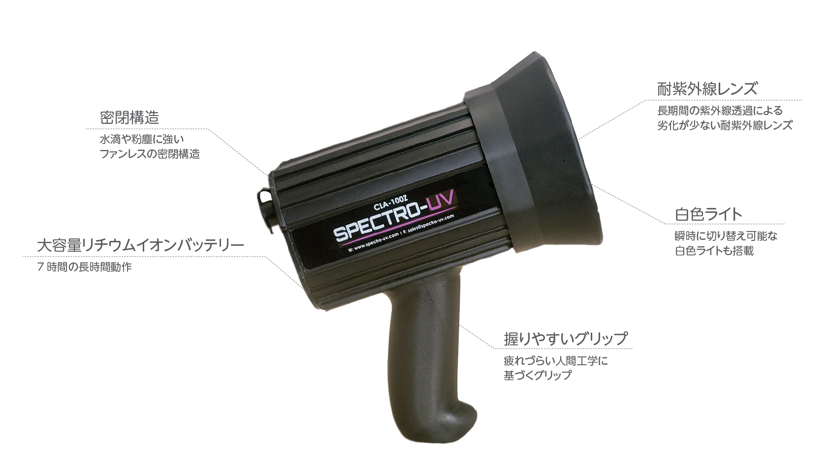 『CLA-100Z』は、価格を抑えながら素晴らしい性能を実現したバッテリー動作のブラックライトです。7時間もの長時間動作により、バッテリー残量を心配することなく検査に集中することができます。