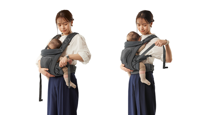 一般的な抱っこひもは、サイズ調節する際に「使用者と赤ちゃんの胸を押し付ける構造」のため、着け心地が悪いと言われていました。PULUAのサイズ調節は、「おしりから引き上げるだけの構造」なので、簡単に心地よい密着抱っこが出来ます。