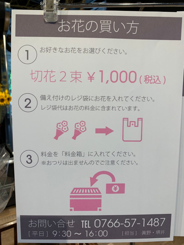 お客様ご自身でお好きなお花を選んでいただき、代金を料金箱に入れ、選んだお花を備え付けの袋に入れてお持ち帰りいただくシンプルなシステムです。