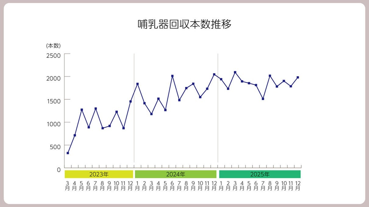 3年前から本格的にはじめた本活動は、開始当初から多くのご家族に反響をいただいています。現在では、全国で1ヵ月に約2,000本の哺乳器が回収されており、その回収本数は年々増加しています。