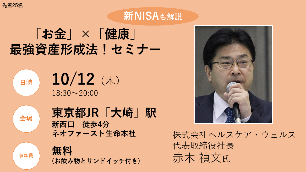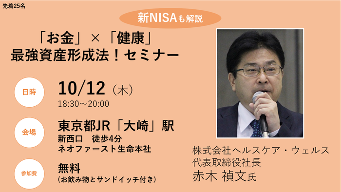 第一生命グループの一員であるネオファースト生命保険株式会社(代表取締役社長:徳岡 裕士、以下「当社」)は10月12日(木)に「『お金』×『健康』最強資産形成法」セミナーを開催いたします。