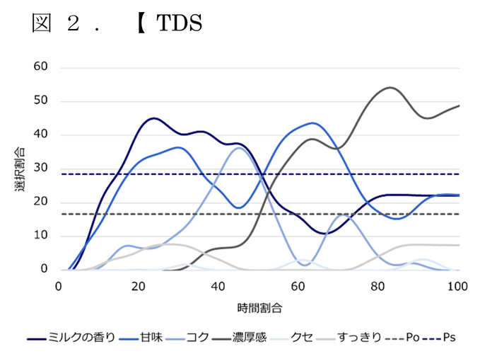 時間経過毎の風味特徴の変化を記録する官能評価手法(Time Intensity法:TI法、Temporal Dominance of Sensation法:TDS法)を用いて、超高温瞬間殺菌(UHT)牛乳を口に含んでから飲み込んだ後までの風味を評価した。