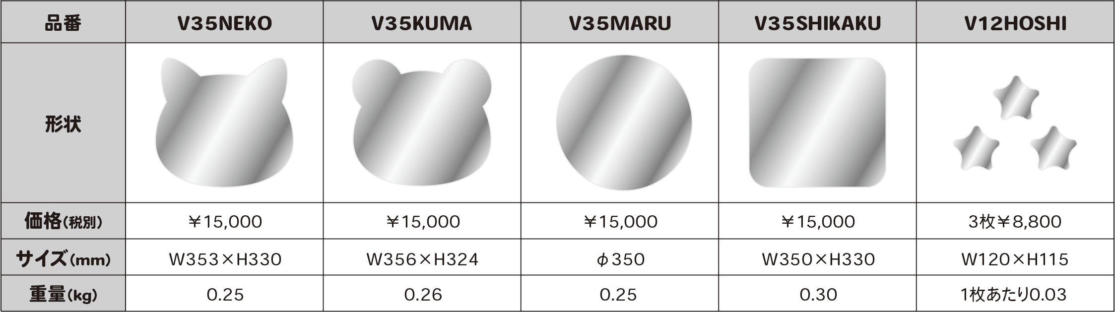 従来の『ワーレン』はビスで壁面に設置するタイプですが、新しいワーレンは両面テープで貼り付けるだけで簡単に設置できるようになりました。形状は「ねこ」「くま」「まる」「しかく」「ほし」の5種類。壁に貼るだけでお部屋を明るく演出してくれます。ミラーは面取り加工で安全性を強化し、教育施設や医療・介護施設など幅広い用途に対応します。