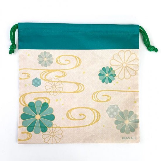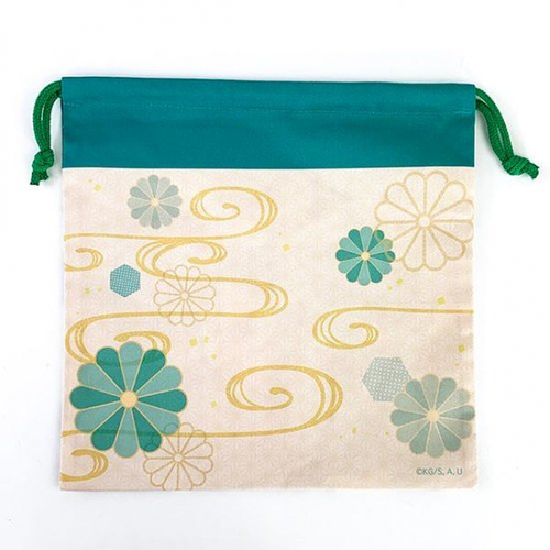 炭治郎のカラーでもある、グリーンを基調としたデザイン。日論刀を手に戦っている姿がデザインされた巾着です。