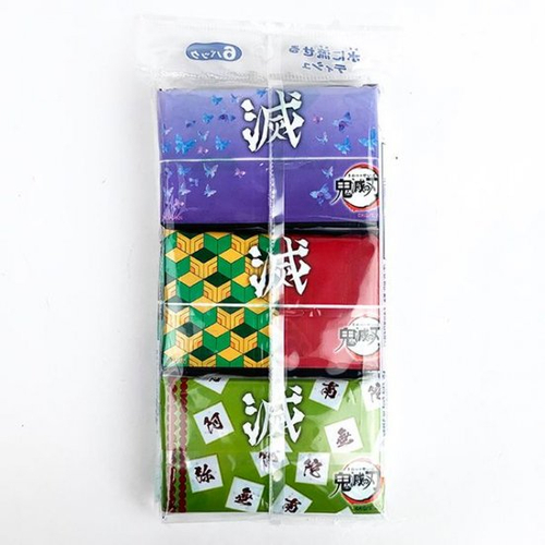 鬼滅のキャラクターをモチーフにしたデザインが、ポケットティッシュのパッケージに♪炭治郎を始め、柱たちのデザインのティッシュが6個セットになっています。