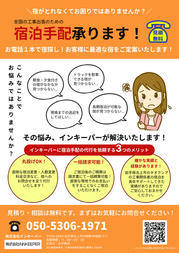 急な宿泊日程・人数の変更や料金交渉、トラックが駐車できる駐車場の確保など、慣れない宿泊手配業務を工事関係者の方たちに代わり株式会社インキーパーが代行しておこなうことにより、工事関係者の出張を全面サポートいたします。