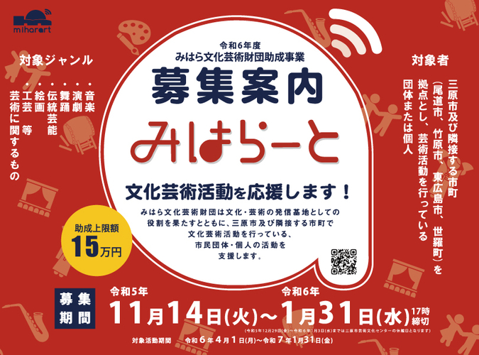 みはら文化芸術財団は文化・芸術の発信基地としての役割を果たすとともに、広島県三原市及び隣接する市町で計画性・企画力・発信性・発展性を持ち合わせた文化芸術活動を行っている、市民団体・個人の活動を支援します。