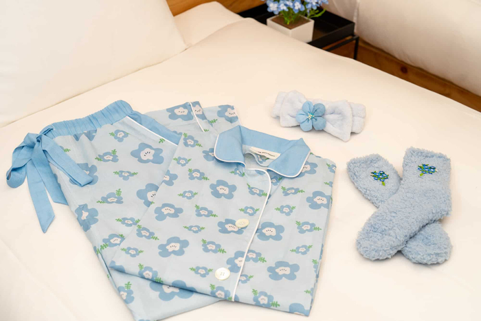滞在をより一層を楽しむために、客室には、本プランオリジナルのネモフィラのアイテムを用意します。ネモフィラの花柄のパジャマ、花弁のワンポイントが付いた淡い青色のルームソックスやヘアバンドを身にまとうと、まるでお花畑でネモフィラに包まれているような気分を味わえます。おそろいの恰好で、写真を撮るのもおすすめです!