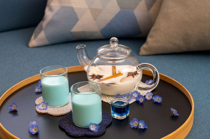 ネモフィラをイメージした、スパイスの効いた淡く青いチャイ「ネモチャイ」を客室で味わえます。ポットの底に、青いバタフライピーのシロップ、その上に生姜やシナモン、スターアニスといったスパイスが入った温かいミルクが入っていて、グラスに注ぐと、シロップとミルクが混ざる仕立てです。かわいらしい淡い青色に変化していく様子を楽しむことができます。