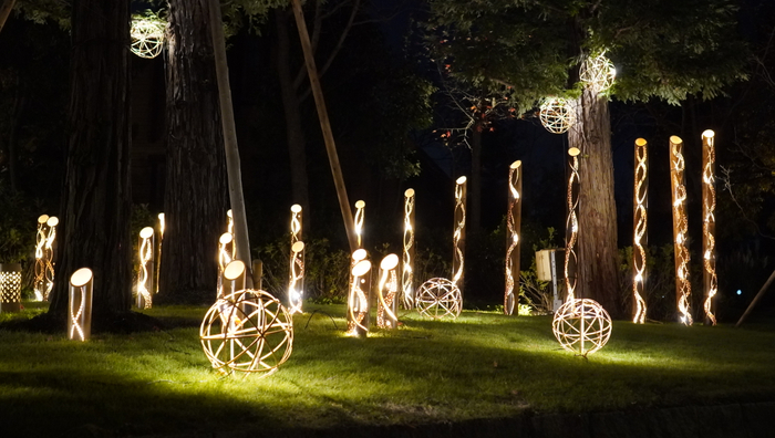 展示の中心である西洋井戸周辺では、竹灯りが織りなす柔らかな光が庭園全体を優しく包み込みます。澄んだ冬の夜空の下、竹灯りと瞬く星空が美しく共演する光景は、まさにフォトジェニックなひとときです。