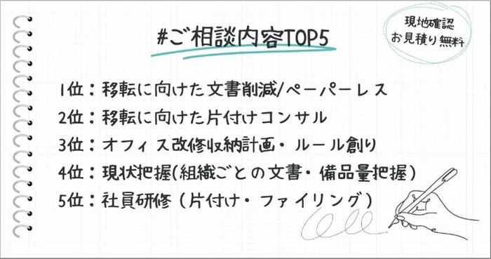 ご相談内容トップ5にもあるような、オフィス移転や改修に伴う『紙やモノの最適化』は、様々な企業にとって大きな課題です。
