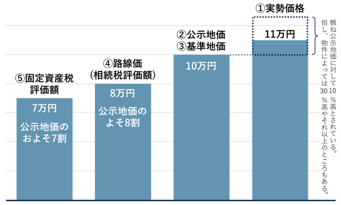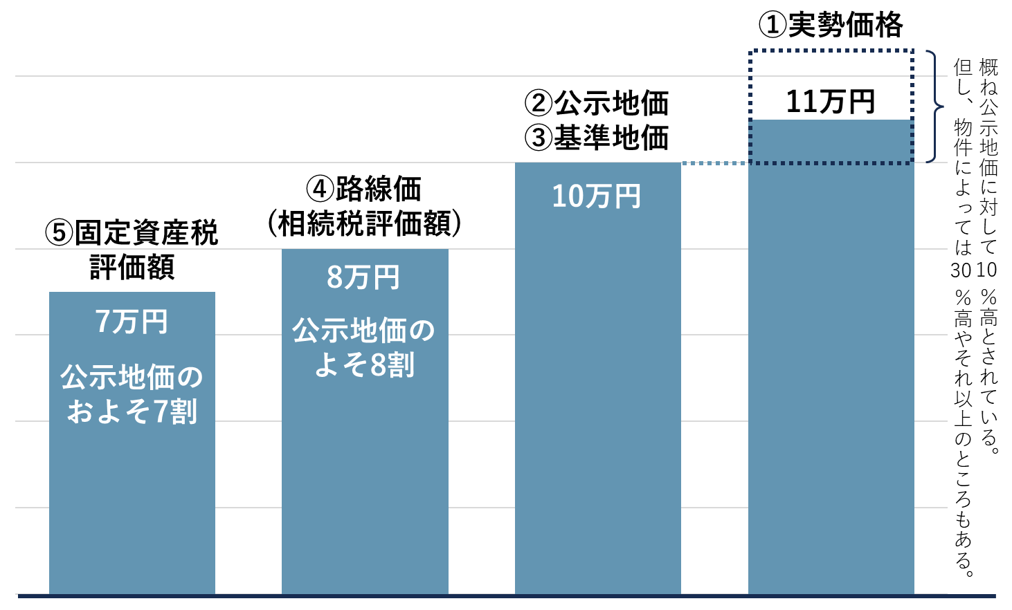 一物五価(いちぶつごか)=「①実勢価格」「②公示地価(価格)」「③基準地価(価格)」「④路線価(相続税評価額)」「⑤固定資産税評価額」の関係性についてみてみましょう。